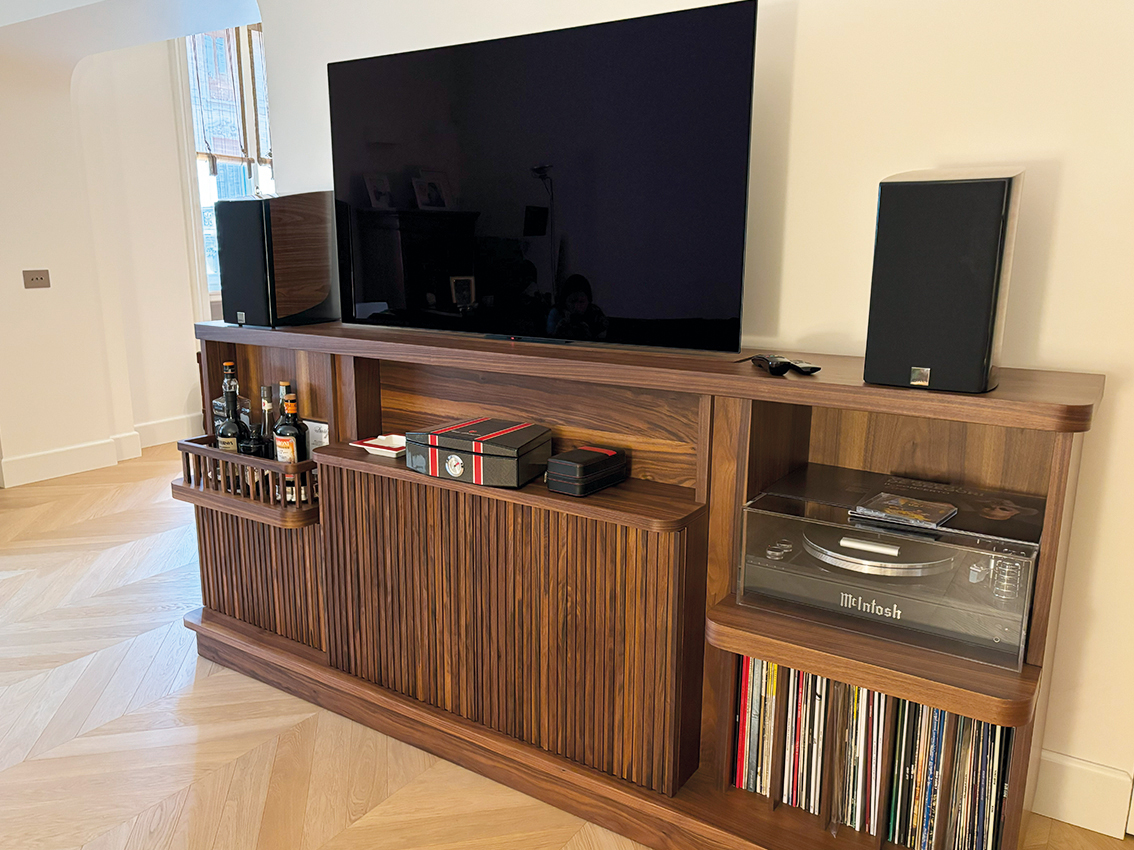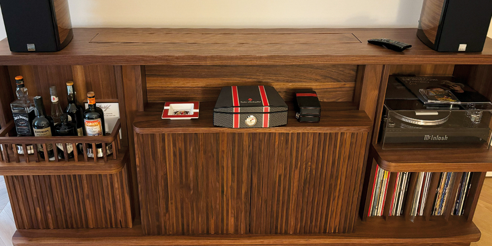 Il mobile realizzato in legno di noce massello con il piano estraibile e l’uscita della Tv. automatizzato con telecomando.